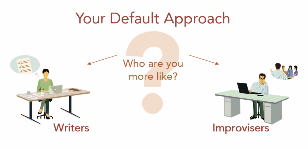 Most people are a combination of both Writer and Improviser, but they each have a particular comfort zone they default to, especially under pressure. For most people, adapting to your Default Approach requires applying skills and changes in behavior that feel uncomfortable, sometimes unnatural. Recognizing and accepting the need for these adjustments is an important part of the improvement process.