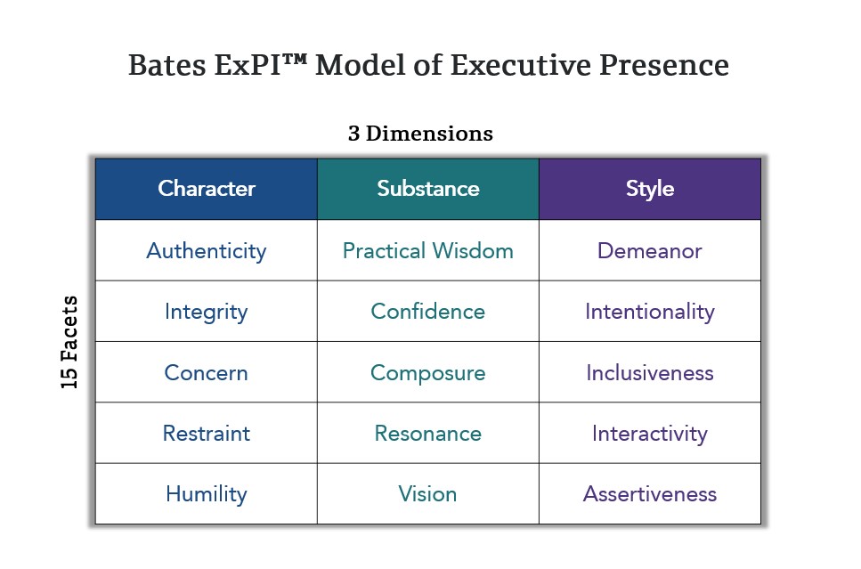 - The facets go beneath the surface. One of the challenges surrounding the idea of executive presence is that too often it focuses too much on appearance. While appearance plays a role in Bates’ model (it’s part of the Demeanor facet), it is no more important than any other facet. Further, she talks about Demeanor in terms of how it affects other people. For example, do you appear healthy, well-groomed, and appropriate for the situation? As with all the facets, success is determined by another’s perception of you in a particular context.